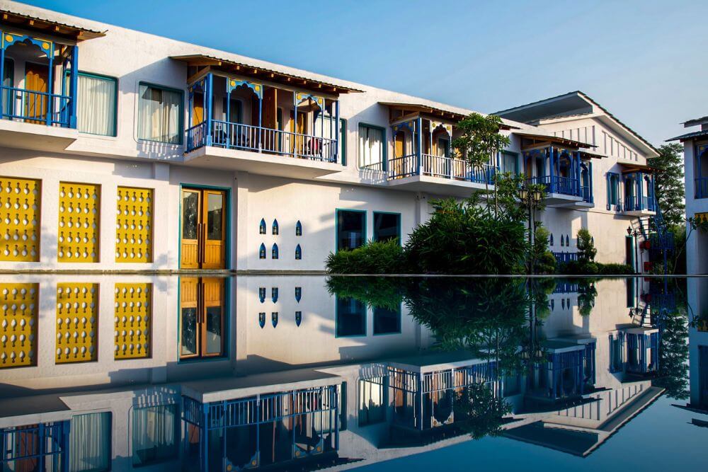 The Mallard Corbett, a luxury resort in Jim Corbett, is designed with a traditional whitewashed Greek aesthetic, blended with earthy Bohemian minimalism. The decor, featuring carefully curated patterned rugs, dream catchers, and quirky hanging textiles, captures the free-spirited essence of this unique place. This property defies a single style, combining elements of rustic charm, colonial elegance, and tribal influences. Its eclectic nature is precisely what makes it so special, as these divers